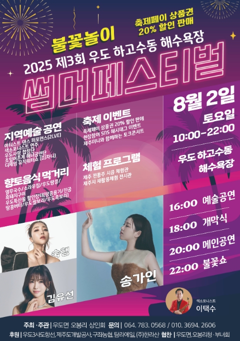 허성일 우도면장은 “우도는 연간 150만 명이 찾는 관광지이지만, 아직 야간관광은 활성화되지 못한 실정”이라며, “이번 ‘썸머페스티벌이 머무는 관광지로서 우도의 잠재력을 보여주고, 지역 상생과 친환경 가치까지 함께 실현하는 계기가 되길 기대한다”고 밝혔다.