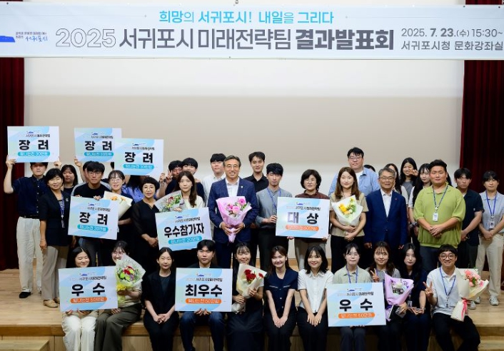 [뉴스노크=김인호 기자] 서귀포시는 23일 서귀포시청 문화강좌실에서 미래전략팀 참가자 8개팀 40명과 외부심사위원, 공직자 등 150여 명이 참석한 가운데 ‘2025 서귀포시 미래전략팀 결과발표회'를 개최했다.