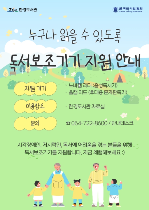 이번 사업은 국립장애인도서관이 주관하고 한국도서관협회가 시행하는‘2025년 독서보조기기 지원 사업’의 일환으로 추진됐다. 한경도서관은 해당 사업에 최종 선정되어 음성독서기(노바캠 리더) 1대, 휴대용 문자판독기(올캠 리드) 2대 등 총 2종의 기기를 지원받았다.