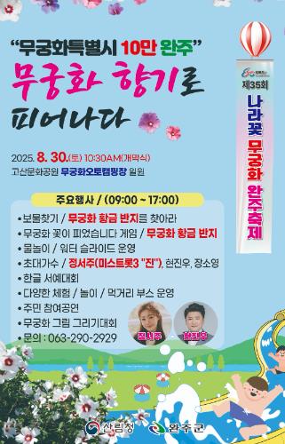 [뉴스노크=김인호 기자] 완주군이 광복 80주년을 기념하며 제35회 나라꽃 무궁화 완주축제를 오는 30일 오전 10시 30분에 고산문화공원(무궁화오토캠핑장 일원)에서 개최한다.