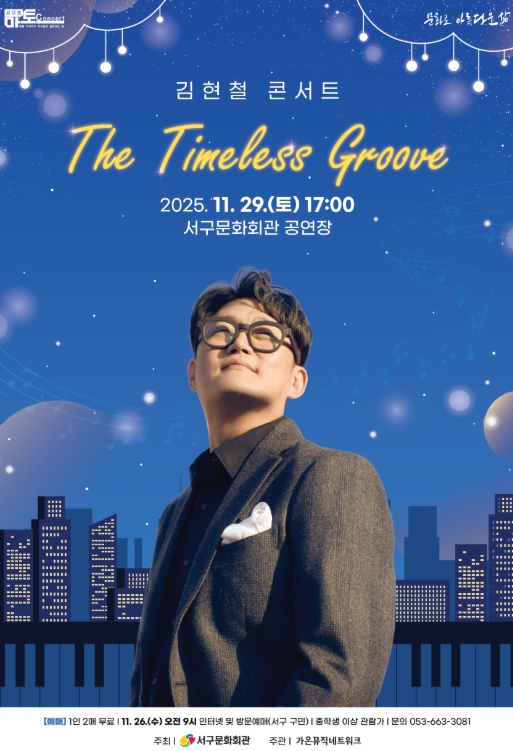 [뉴스노크=김인호 기자] 서구문화회관은 11월 29일 오후 5시 서구문화회관 공연장에서 2025 서구愛 마토콘서트 피날레로‘김현철 콘서트 : The Timeless Groove’를 개최한다.