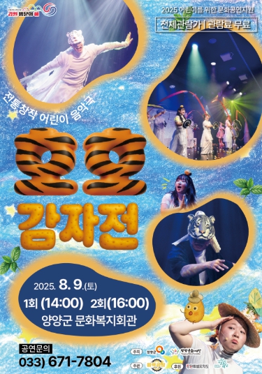 오는 8월 9일에는 전통창작 어린이 음악극 “호호 감자전” 공연이 오후 2시와 4시, 문화복지회관 공연장에서 1일 2회 공연한다.