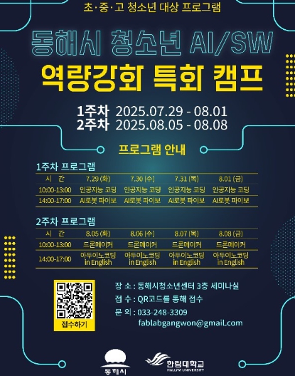[뉴스노크=김인호 기자] 동해시와 한림대학교가 공동 주최하는 '동해시 청소년 AI/SW 역량강화 특화 캠프'가 2025년 여름방학을 맞아 동해시청소년수련관에서 열린다. 이번 캠프는 관내 초·중·고등학생을 대상으로 하며, 1주차와 2주차로 나뉘어 총 8일간 진행된다.