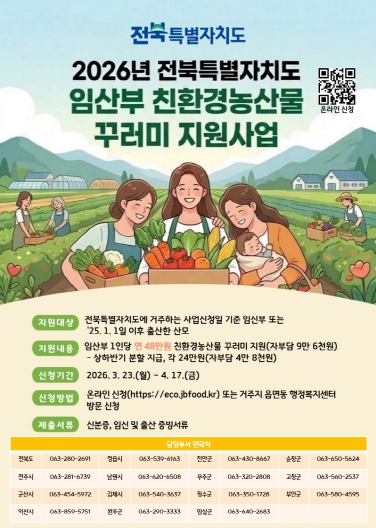 [뉴스노크=김인호 기자] 전북특별자치도가 임산부의 건강 증진과 친환경 농산물 소비 확대를 위해‘임산부 친환경농산물 꾸러미 지원사업’신청을 오는 3월 23일부터 4월 17일까지 모집한다고 19일 밝혔다.