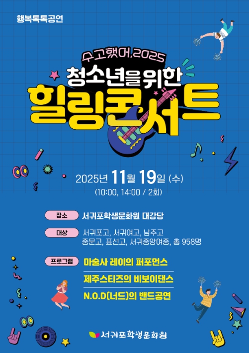 [뉴스노크=김인호 기자] 제주도교육청 서귀포학생문화원은 19일 서귀포학생문화원 대강당에서 행복톡톡 공연 ‘수고했어 2025, 청소년을 위한 힐링콘서트’를 오전 10시와 오후 2시 두 차례에 걸쳐 개최한다.
