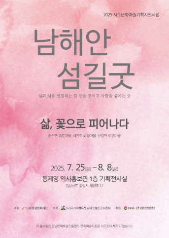 [뉴스노크=김인호 기자] (재)통영문화재단 주최, (사)남해안별신굿보존회 주관으로 7월 25일부터 8월 7일까지 통제영거리 역사홍보관 기획전시실에서 ‘삶, 꽃으로 피어나다’ 전시회를 개최한다.
