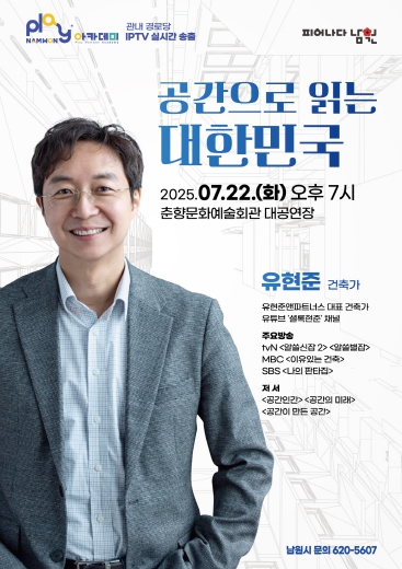 [뉴스노크=김인호 기자] 남원시는 22일 오후 7시, 춘향문화예술회관 대공연장에서 대한민국을 대표하는 건축가 유현준 교수를 초청하여 “공간으로 읽는 대한민국”이라는 주제로 강연을 개최한다.