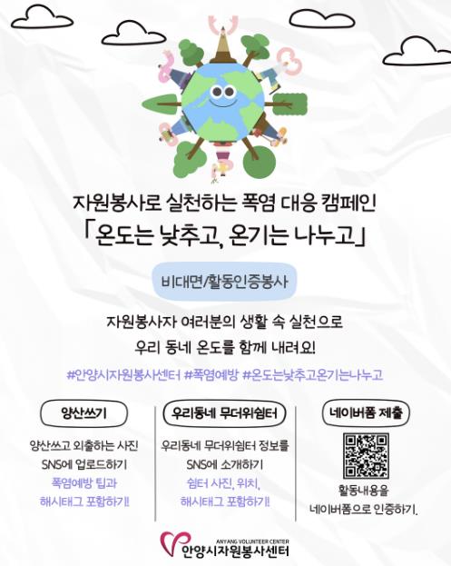 [뉴스노크=김인호 기자] 안양시자원봉사센터는 기록적인 폭염에 대응하고 시민 건강을 보호하기 위해 8월부터 자원봉사로 실천하는 폭염 대응 캠페인 ‘온도는 낮추고, 온기는 나누고’를 추진한다고 31일 밝혔다.