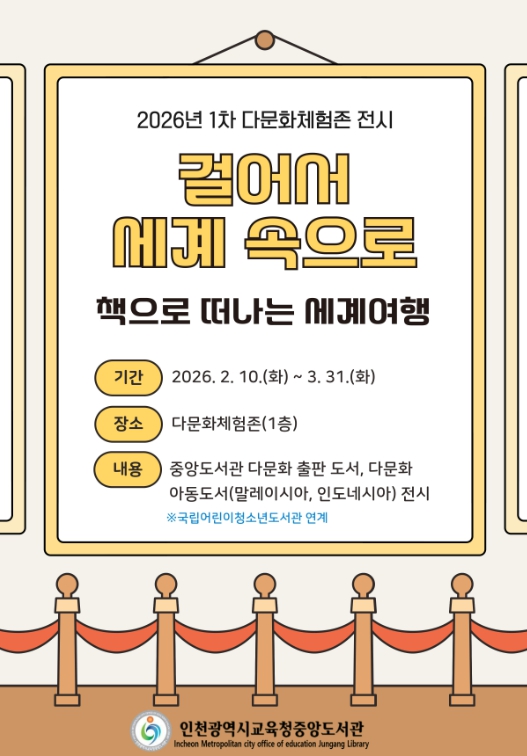 [뉴스노크=김인호 기자] 인천광역시교육청중앙도서관은 2월 10일부터 3월 31일까지 1층 다문화체험존에서 ‘책으로 떠나는 세계여행’ 전시를 개최한다.