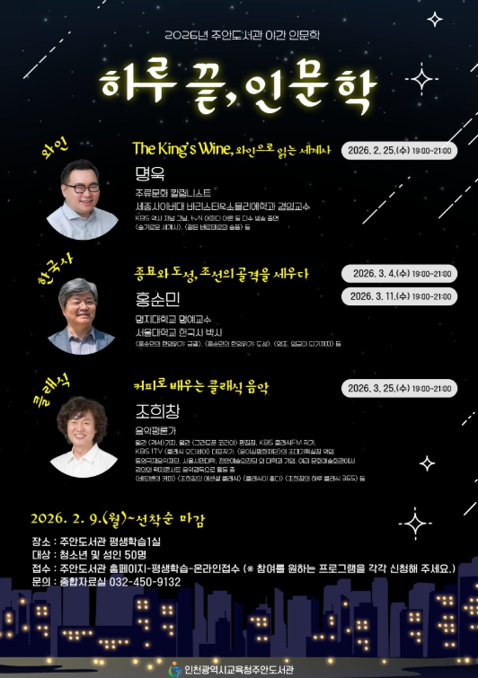 [뉴스노크=김인호 기자] 인천광역시교육청주안도서관은 2월부터 3월까지 시민들이 다양한 인문학 주제를 접할 수 있는 야간 인문학 프로그램 ‘하루 끝, 인문학’을 운영한다.