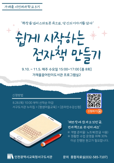 [뉴스노크=김인호 기자] 인천광역시교육청서구도서관은 가재울 시민저자학교 5기 프로그램 ‘쉽게 시작하는 전자책 만들기’를 운영한다.