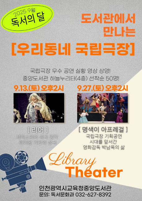 [뉴스노크=김인호 기자] 인천광역시교육청중앙도서관은 9월 13일과 27일 ‘우리 동네 국립극장’ 공연 실황 영상 상영회를 개최한다.