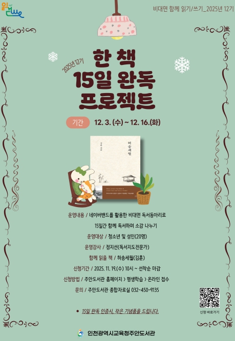 [뉴스노크=김인호 기자] 인천광역시교육청주안도서관은 11월 19일 오전 10시부터 ‘12기 비대면 함께 읽기-한 책 15일 완독 프로젝트’ 참여자를 모집한다.