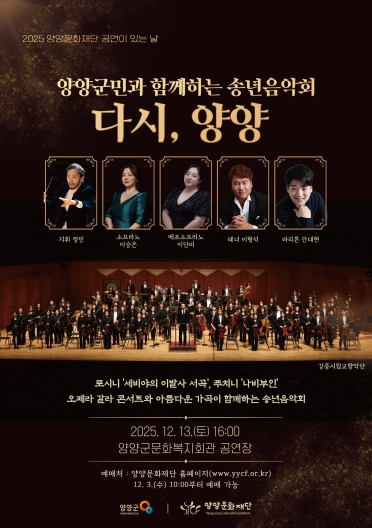 [뉴스노크=김인호 기자] (재)양양문화재단은 오는 12월 13일 오후 4시, 양양군문화복지회관 공연장에서 정민 상임지휘자가 이끄는 강릉시립교향악단과 소프라노 이승은, 메조소프라노 이단비, 테너 이형석, 바리톤 안대현이 함께하는 '2025 양양군민과 함께하는 송년음악회 – 다시, 양양'을 개최한다.