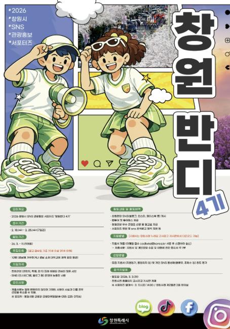 [뉴스노크=김인호 기자] 창원특례시는 창원 관광의 매력을 알릴 참신한 온라인 콘텐츠를 발굴하고 시민과 소통하는 관광홍보를 강화하기 위해 '2026 창원시 SNS 관광홍보 서포터즈 ‘창원반디 4기’'를 모집한다고 밝혔다.