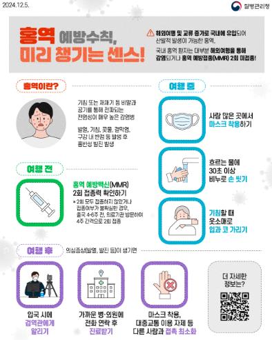 홍역은 전염력이 매우 높은 호흡기감염병으로, 예방접종을 통해 충분히 예방이 가능하지만, 최근 일부 국가에서의 유행으로 인해 해외여행자들의 주의가 필요한 상황이다.