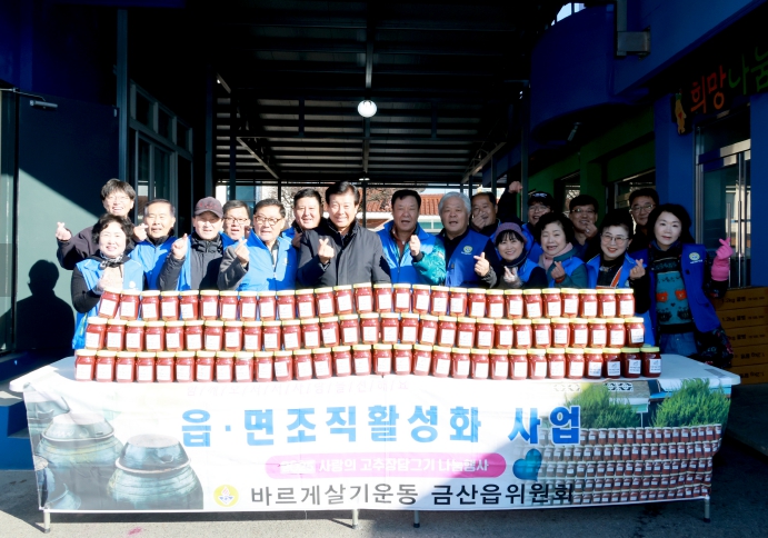 [뉴스노크=김인호 기자] 금산군 바르게살기운동 금산읍위원회(회장 김광옥)는 11월 28일 금산읍행정복지센터에서 사랑의 고추장 담그기에 나서며 이웃사랑을 실천했다.