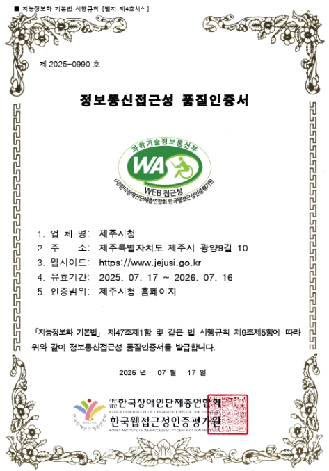 제주시 누리집은 2014년 첫 인증 획득 이후 매년 과학기술정보통신부의 ‘한국형 웹 콘텐츠 접근성 지침’을 철저히 준수하며, 콘텐츠와 시스템을 지속적으로 보완·개선해 왔다.