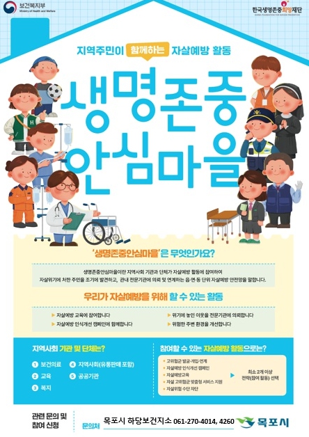 ‘생명존중 안심마을’은 지역 내 다양한 기관과 단체가 협력해 자살 고위험군을 조기에 발굴하고, 지역 특성에 맞는 자살예방 활동을 추진하는 지역사회 기반의 자살예방 모델이다.