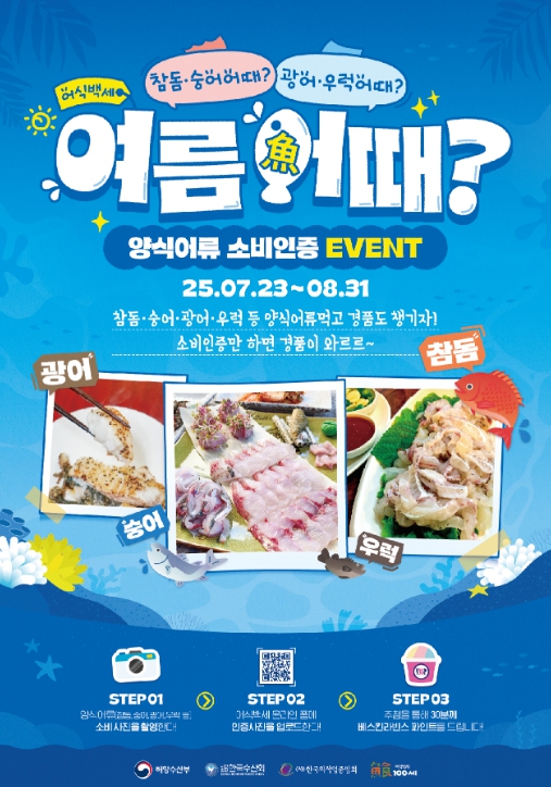 [뉴스노크=김인호 기자] 해양수산부는 여름철 양식수산물 소비 활성화를 위해 7월 23일부터 8월 31일까지 한국수산회·한국외식업중앙회·수협중앙회와 함께 '어식백세-여름어(魚)때?' 캠페인을 실시한다고 밝혔다.