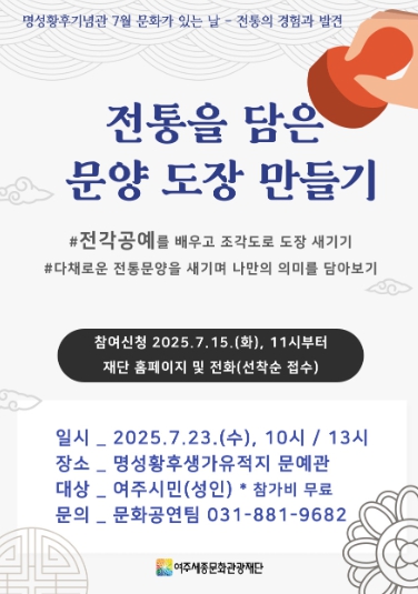 [뉴스노크=김인호 기자] 여주세종문화관광재단은 오는 7월 23일, 명성황후기념관 7월 문화가 있는 날프로그램으로‘전통을 담은 문양도장 만들기’를 진행한다.