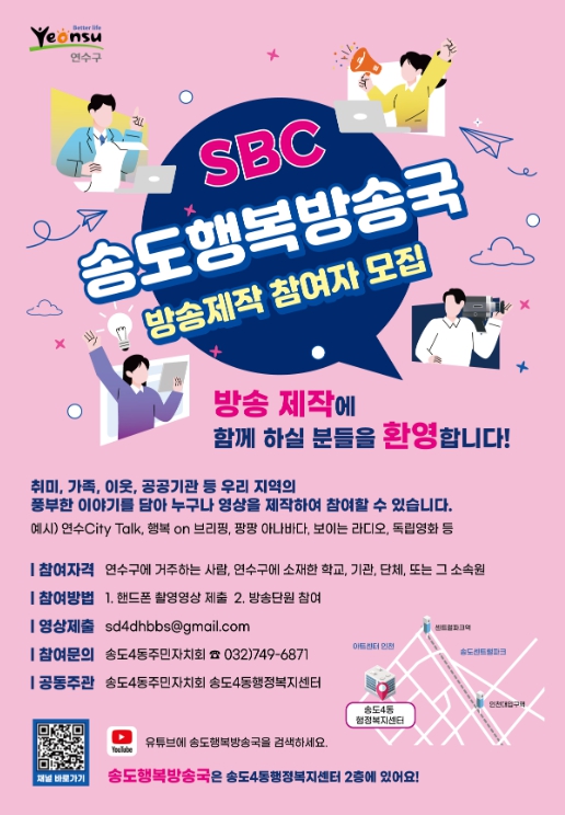 [뉴스노크=김인호 기자] 송도행복방송국(공동위원장 송도4동장 양만상, 송도4동 주민자치회장 양경엽)이 2026년 방송 프로그램 제작에 참여할 연수구 주민을 모집한다.