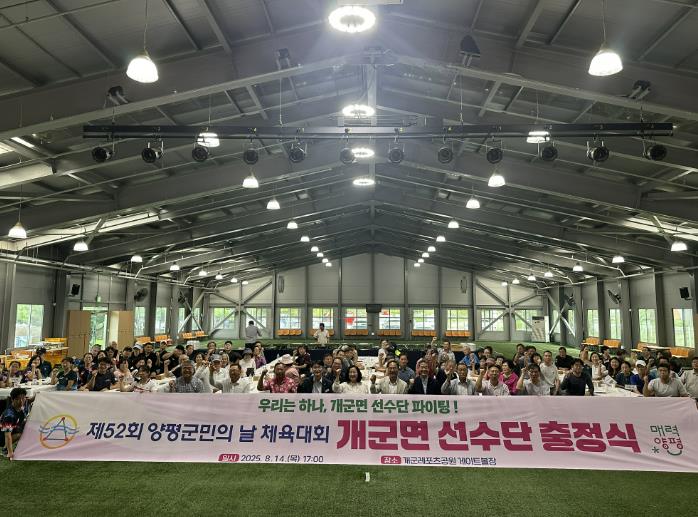 한편, 제52회 양평군민의 날 체육대회는 오는 9월 11일 물맑은양평종합운동장에서 개최되며, 개군면은 축구, 족구, 게이트볼, 육상, 테니스, 탁구, 배드민턴, 파크골프 8개 종목에 104명이 참가해 선전을 펼칠 계획이다.