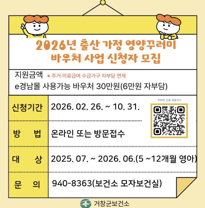 [뉴스노크=김인호 기자] 거창군은 관내 영아의 건강한 발달과 출산 가정의 경제적 부담을 경감하기 위해 26일부터 ‘출산 가정 영양꾸러미 바우처 지원사업’ 신청을 받는다고 밝혔다.