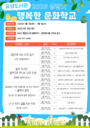 [뉴스노크=김인호 기자] 대전 유성구는 4월부터 7월까지 주민의 문화 향유 기회를 확대하고 정서적 치유를 지원하기 위한 ‘2026년 상반기 행복한 문화학교’를 운영한다.