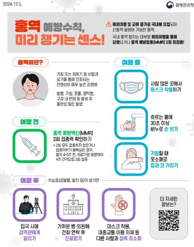 홍역 유행 국가 방문 후 3주 이내 발열, 발진 등 홍역 의심 증상이 나타나면 타인과의 접촉을 최소화하고, 반드시 마스크를 착용한 뒤 가까운 의료기관에 방문해 해외 여행력을 의료진에게 알리고 진료받는 것이 중요하다.