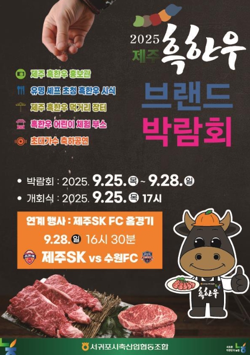 [뉴스노크=김인호 기자] 서귀포시는 추석 명절을 앞두고 제주 흑한우의 가치를 널리 알리고, 소비촉진을 통해 지역 축산업과 경제 활성화에 기여하고자 오는 9월 25일부터 9월 28일까지 4일간 제주월드컵경기장 광장에서 ‘2025 제주 흑한우 브랜드 박람회’를 개최한다고 밝혔다.