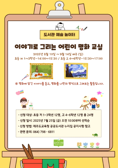 [뉴스노크=김인호 기자] 제주도교육청 송악도서관은 8월 10일부터 오는 9월 14일까지 초등학생을 대상으로‘2025 도서관 예술 놀이터-이야기로 그리는 어린이 명화 교실’을 운영한다.