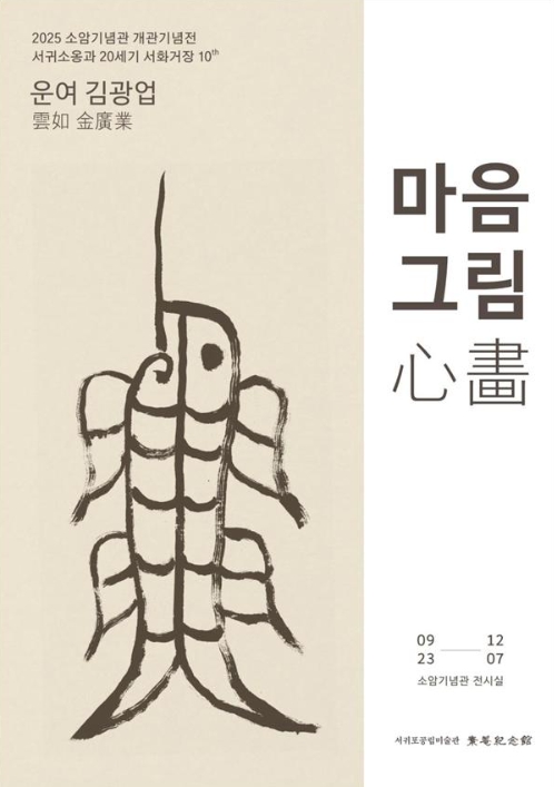 [뉴스노크=김인호 기자] 서귀포공립미술관 소암기념관에서는 ‘서귀소옹과 서화거장’ 열 번째 전시로 서예가 운여 김광업(雲如 金廣業, 1906~1976)의 예술세계를 조명하는《운여 김광업, 마음그림心畵》을 오는 9월 23일부터 12월 7일까지 전시한다고 밝혔다.