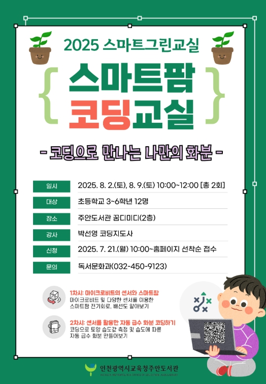 [뉴스노크=김인호 기자] 인천광역시교육청주안도서관은 여름방학을 맞아 8월 2일과 9일 초등학교 3~6학년 학생을 대상으로 ‘스마트팜 코딩교실 '코딩으로 만나는 나만의 화분'’을 운영한다.