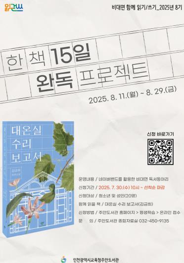[뉴스노크=김인호 기자] 인천광역시교육청주안도서관은 비대면 함께 읽기 프로그램 ‘15일 완독 프로젝트’ 참여자를 모집한다고 24일 밝혔다.