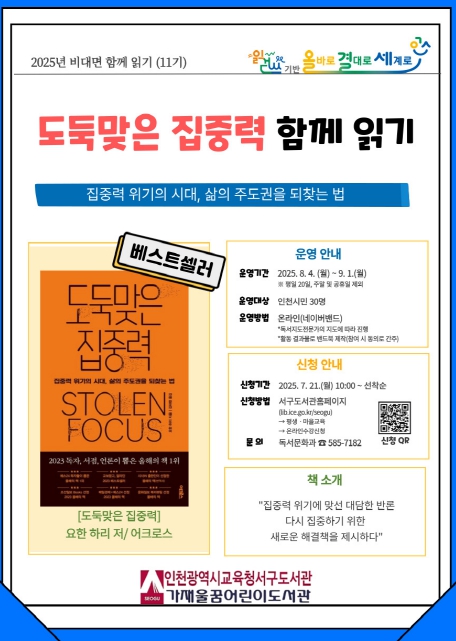 [뉴스노크=김인호 기자] 인천광역시교육청서구도서관은 ‘비대면 함께읽기’ 11기 프로그램으로 ‘도둑맞은 집중력’을 선정하고, 8월 4일부터 9월 1일까지 운영한다.
