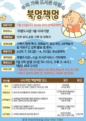 [뉴스노크=김인호 기자] 인천광역시교육청부평도서관은 여름방학을 맞아 유아‧초등 가족 대상 ‘우리 가족 도서관 바캉스 북멍책멍’ 프로그램을 운영한다.