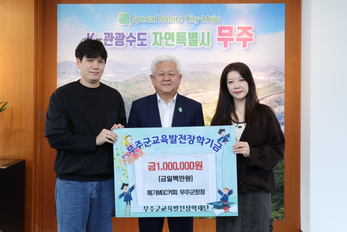 [뉴스노크=김인호 기자] 메가MGC커피 무주군청점에서 지난 23일 (재)무주군교육발전장학재단(이사장 황인홍 무주군수)에 장학금 1백만 원을 기탁했다.