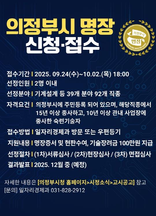 [뉴스노크=김인호 기자] 의정부시는 우수 숙련기술인을 발굴하고 숙련기술 우대 문화를 확산하기 위해 ‘2025년도 의정부시 명장’을 공모해 선정한다.
