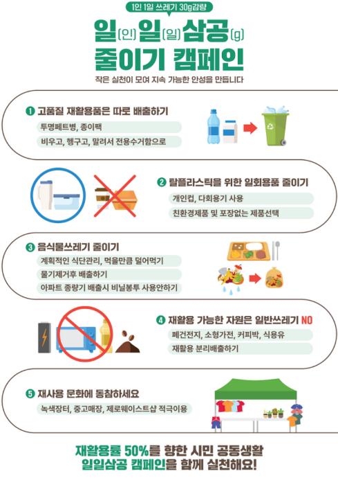 최근 3년간 안성시의 생활쓰레기 재활용률은 40%대 수준에 머물러 있으며, 분리배출 미흡으로 인해 재활용 가능한 자원이 일반쓰레기로 배출되는 사례가 지속되고 있다. 이에 시는 재활용률 50% 달성을 목표로, 시민이 하루에 배출하는 쓰레기를 30그램씩 줄이는 생활 속 실천운동을 전개하고 있다.