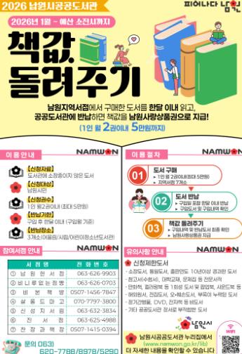 남원시 관계자는 “이번 책값 돌려주기 사업 확대를 통해 도서관과 지역서점 간 상생 협력이 강화되고, 시민들의 독서 접근성이 높아지는 것은 물론 지역경제에도 긍정적인 효과가 있을 것으로 기대한다”며 “앞으로도 시민 의견을 적극 반영해 독서문화 확산과 지역서점 활성화를 아우르는 정책을 지속적으로 추진하겠다”고 말했다.