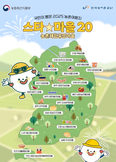 지역특산물을 활용한 약선밥상과 핀란드식 사우나를 체험할 수 있는 ‘달래촌마을’을 포함하여 전통 다랭이논의 멋진 경치를 한눈에 담을 수 있는 ‘두모마을’, 국내 최초 치즈체험을 실시한 ‘임실치즈마을’, BTS의 영상 및 화보 촬영지인 ‘오성한옥마을’ 등이 선정됐으며, ‘스타마을 20선’에 대한 자세한 내용은 ‘농촌여행의 모든 것’을 볼 수 있는'웰촌'누리집에서 확인할 수 있다.