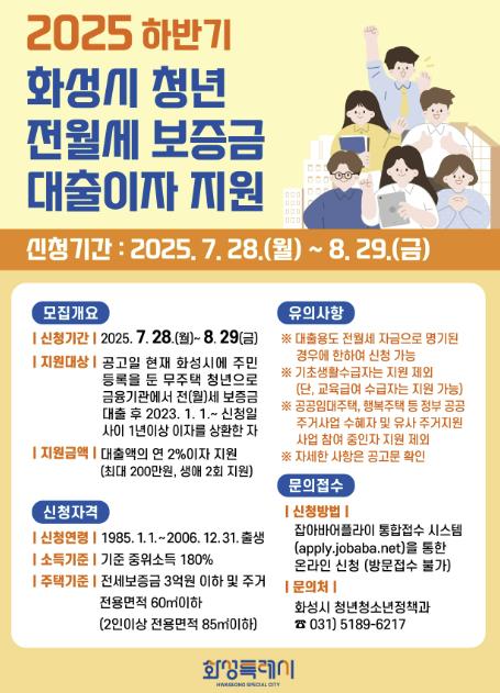 [뉴스노크=김인호 기자] 화성특례시가 28일부터 청년들의 주거비 부담 경감 및 정주 여건 향상을 위해 ‘청년 전·월세 보증금 대출이자 지원 사업’ 하반기 대상자를 모집한다.
