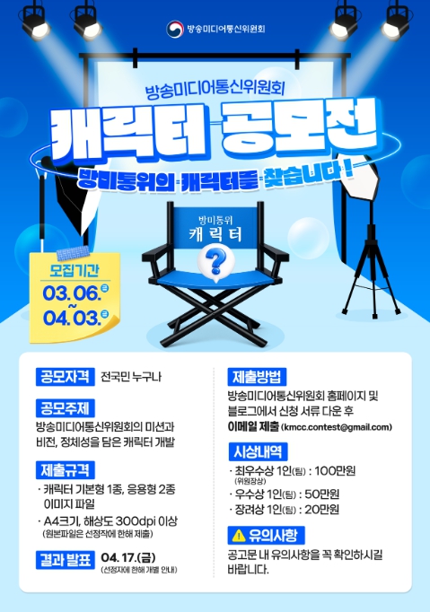 김종철 방미통위원장은 "기관의 새로운 얼굴이 될 캐릭터를 국민과 함께 만들어 가고자 한다"면서 "참신한 아이디어와 많은 참여를 기대한다"고 말했다.