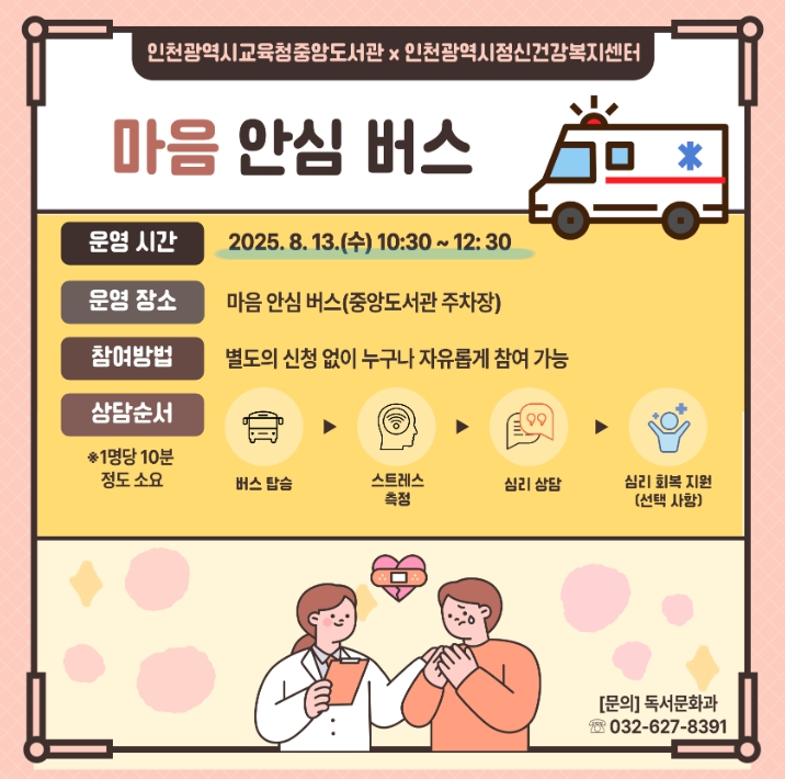 [뉴스노크=김인호 기자] 인천광역시교육청중앙도서관은 오는 8월 13일 인천광역시정신건강복지센터와 협력해 도서관 방문 시민을 대상으로 ‘마음안심버스’ 정신건강 상담 서비스를 운영한다.