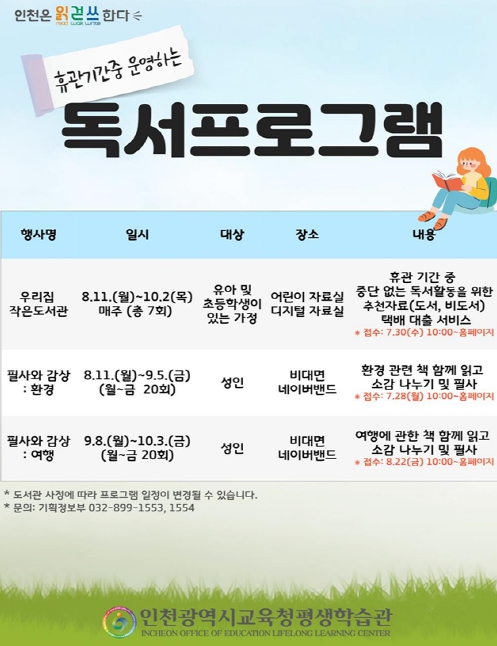 [뉴스노크=김인호 기자] 인천광역시교육청평생학습관은 환경개선 공사로 인한 휴관기간(8월 1일~10월 12일) 동안 비대면 독서프로그램과 도서관 서비스를 운영한다.