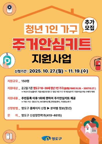 [뉴스노크=김인호 기자] 부산 영도구는 지역 내 청년 1인 가구의 주거 안심도를 높이고 사회적 고립감을 해소하는 등 안전한 주거환경을 조성하고자 ‘청년 1인 가구 주거안심키트 지원사업’을 1차에 이어 2차로 추가 모집에 나선다.