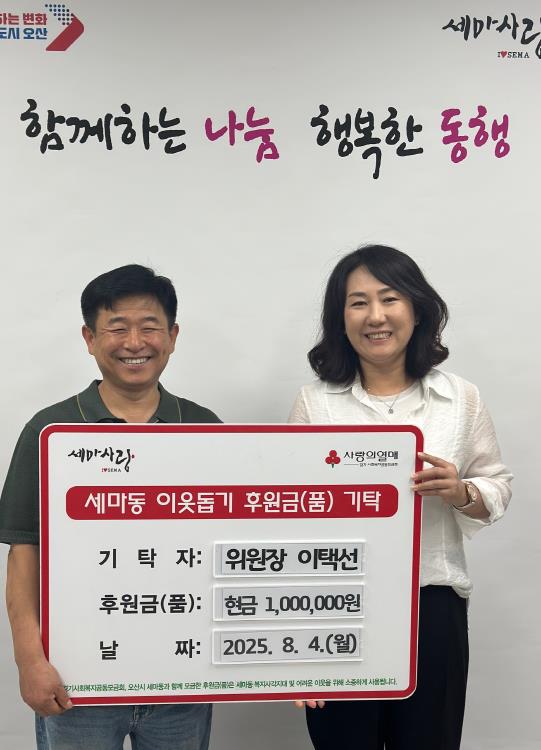 [뉴스노크=김인호 기자] 오산시 세마동 행정복지센터는 지난 8월 4일, 세마동 지역사회보장협의체 이택선 위원장이 지역 내 취약계층을 위해 현금 100만 원을 기부했다고 밝혔다.