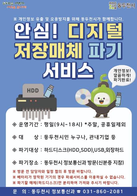 이용을 원하는 동두천시민은 본인 확인이 가능한 신분증과 파기할 저장매체를 지참해 동두천시청 정보통신과(동두천시 방죽로 23, 1층)를 방문하면 된다.