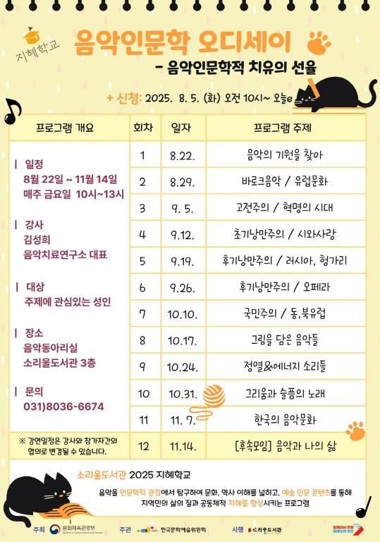이번 프로그램은 문화체육관광부 주최, 한국문화예술위원회 주관의 ‘2025 지혜학교’ 사업의 일환으로, 음악을 인문학적으로 조망하며 지역 공동체의 문화적 지혜 확산과 삶의 질 향상을 목표로 기획됐다.